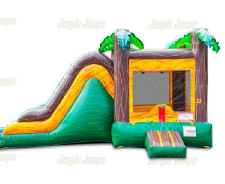 This commercial‑grade combo unit offers a roomy bounce area with an attached, extra‑wide slide that lands in a removable splash pool for wet setups but also works perfectly dry. An entrance ramp and a flapped opening sit beside the slide for easy access and a neat, contained entry. Sized at 13 x 14 x 25 ft, this versatile unit is durable enough for repeated rentals and ideal for backyard parties, school events, or community gatherings where a fun, palm‑themed inflatable attraction is wanted.